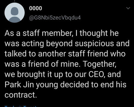 Alguien en Twitter empezó a difundir información sobre que Kim Woojin hacía bullying a los chicos y muchas cosas más. Mientras decía que el CEO (JYPark) lo sabía y por eso había echado a Kim Woojin del grupo y la empresa.
