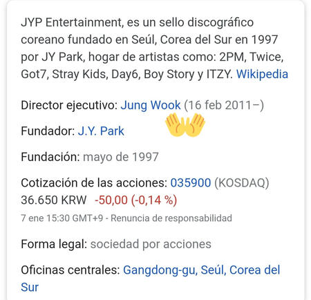 🔵 Pues veamos, el CEO de JYPE en el momento en el que Kim Woojin se fue, era Jung Wook, actual CEO de JYPE, y lo es desde 2011. Por lo tanto, J. Y. Park es el fundador, pero no el CEO. Así que ahí tenemos el gran fallo en el testimonio del supuesto staff.